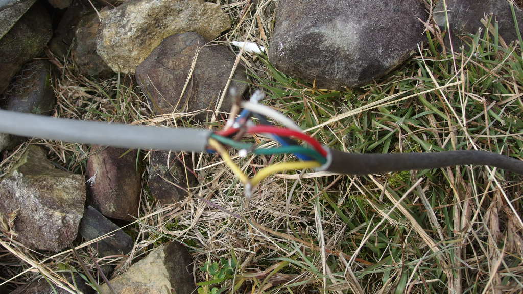 草刈りの時に機械に巻き付いて切れてしまったローテーターケーブルを修復した。痛んでいた部分も含め5mほど削除し、使い古したケーブルを使ってつなぎ直した。銅線が錆びていたろして復旧作業に時間が掛ったが、錆をしっかり落とし半田付けしたので問題はないだろう。無事復旧できて良かった。 |