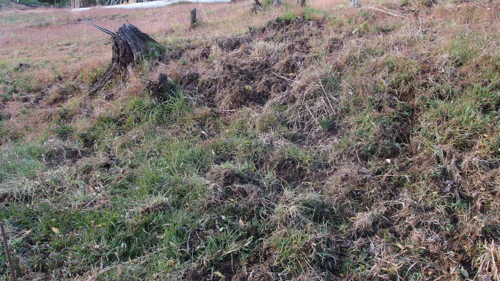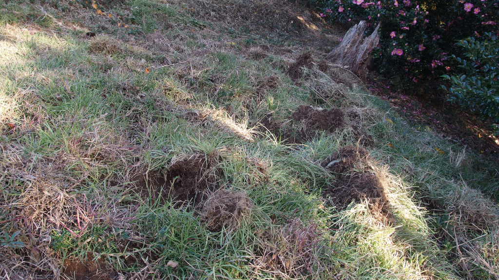 イノシシが地面を掘り起こす被害が続いているようだ。かなり深い穴もあり、草刈り作業に影響が出そうな場所も出てきた。これまで栗の木が折れていたことがあったが、動物の被害とは考えず、対策はしていない。今回はナッツの木が折られたが、添木などをすれば防げるだろうか。これまでには無かった被害なのだが、芝の生育に関係はあるのだろうか。 |
