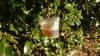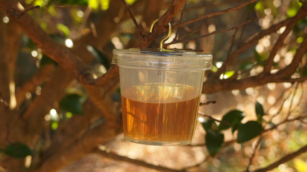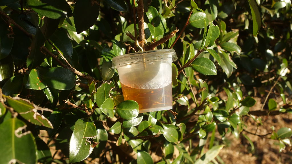 芝が掘り起こされて、地面がボコボコ状態になっている。これ以上荒らされると自走式の草刈機械が使えなくなるので、取り急ぎ忌避剤を使って対策をすることにした。木酢液に動物の忌避効果があるというので、前回地面撒いてみた。効果はまだ分からないが、撒くよりも匂いが持続しそうな方法を試してみることにした。木酢液を入れたカップをサザンカの枝に下げた。雨が入いらないで匂いが外に拡散するよう工夫したが、、、果たして効果は? |